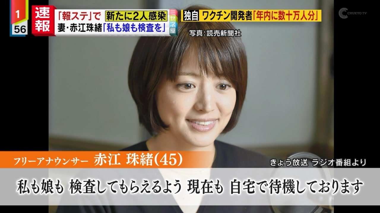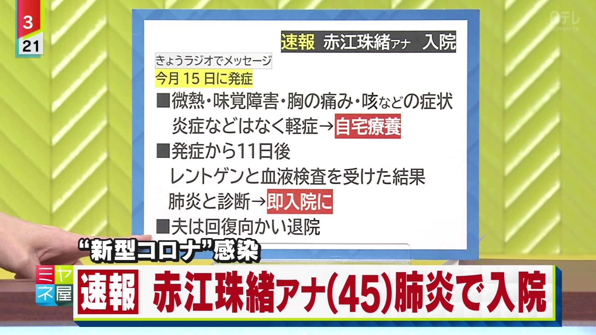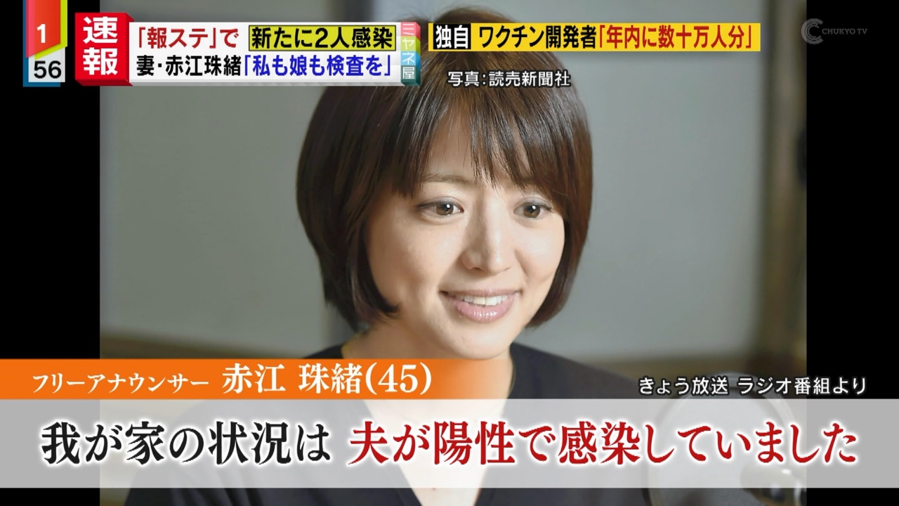 赤江自身は「何の症状もなく、元気にのんきにやっている」と言い、「家全体で社会生活を止めた方がいいなという判断をしました」と説明した。番組には赤江に代わって、同局の外山恵理アナウンサー(44)が出演した。
