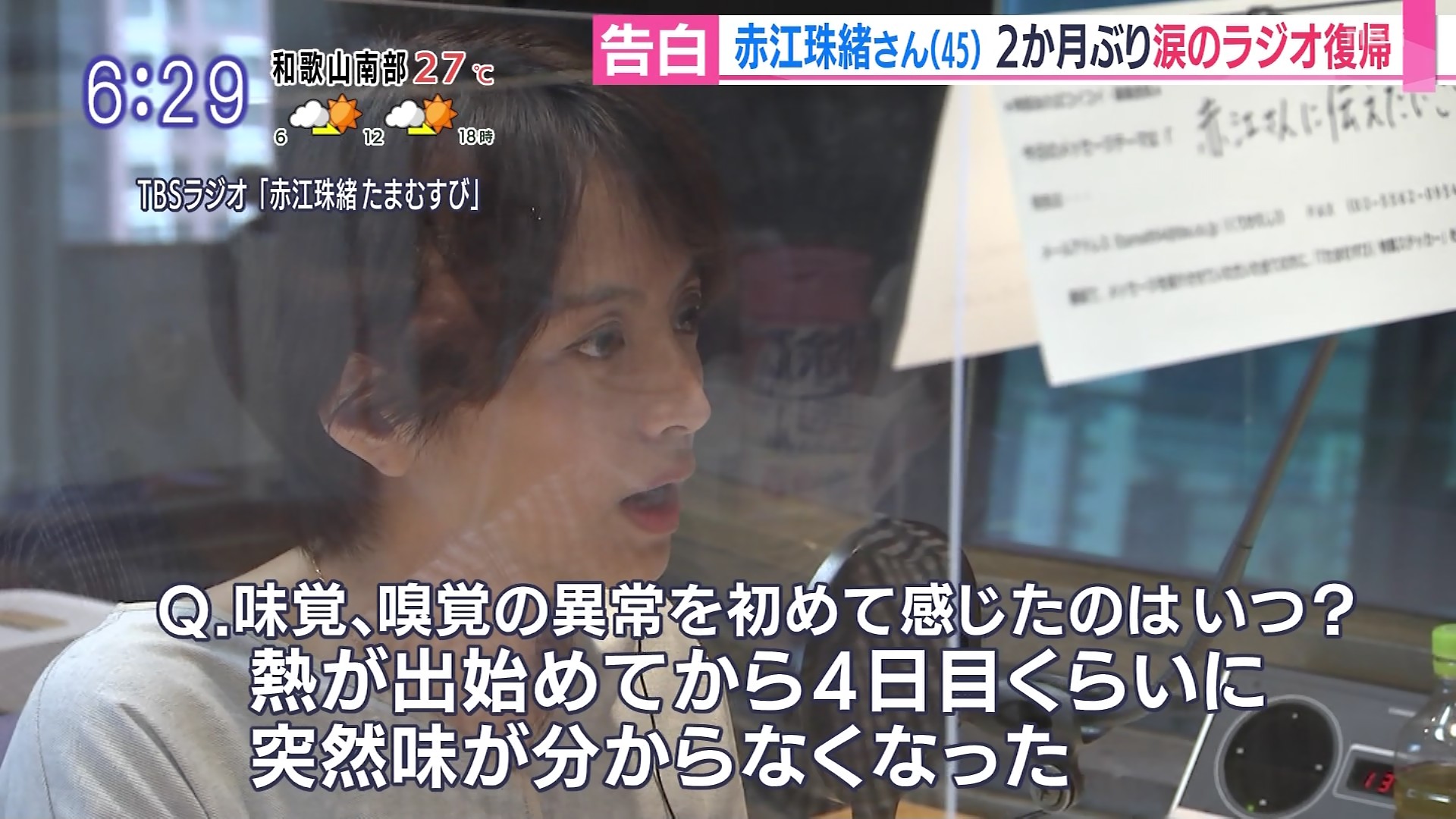 赤江はその事情について、テレビ局勤務の夫が新型コロナウイルス感染の疑いが持たれたとし、「夫の職場で、陽性反応の方が出まして。夫と『それはまずいね〜』みたいな話をしていたら、この週末にうちの夫にも体調を崩しまして。朝に熱が出て夜になると高熱が続いて。で、味も…と言い出したんですよ。これはまずいなっていうことになって」と明かした。