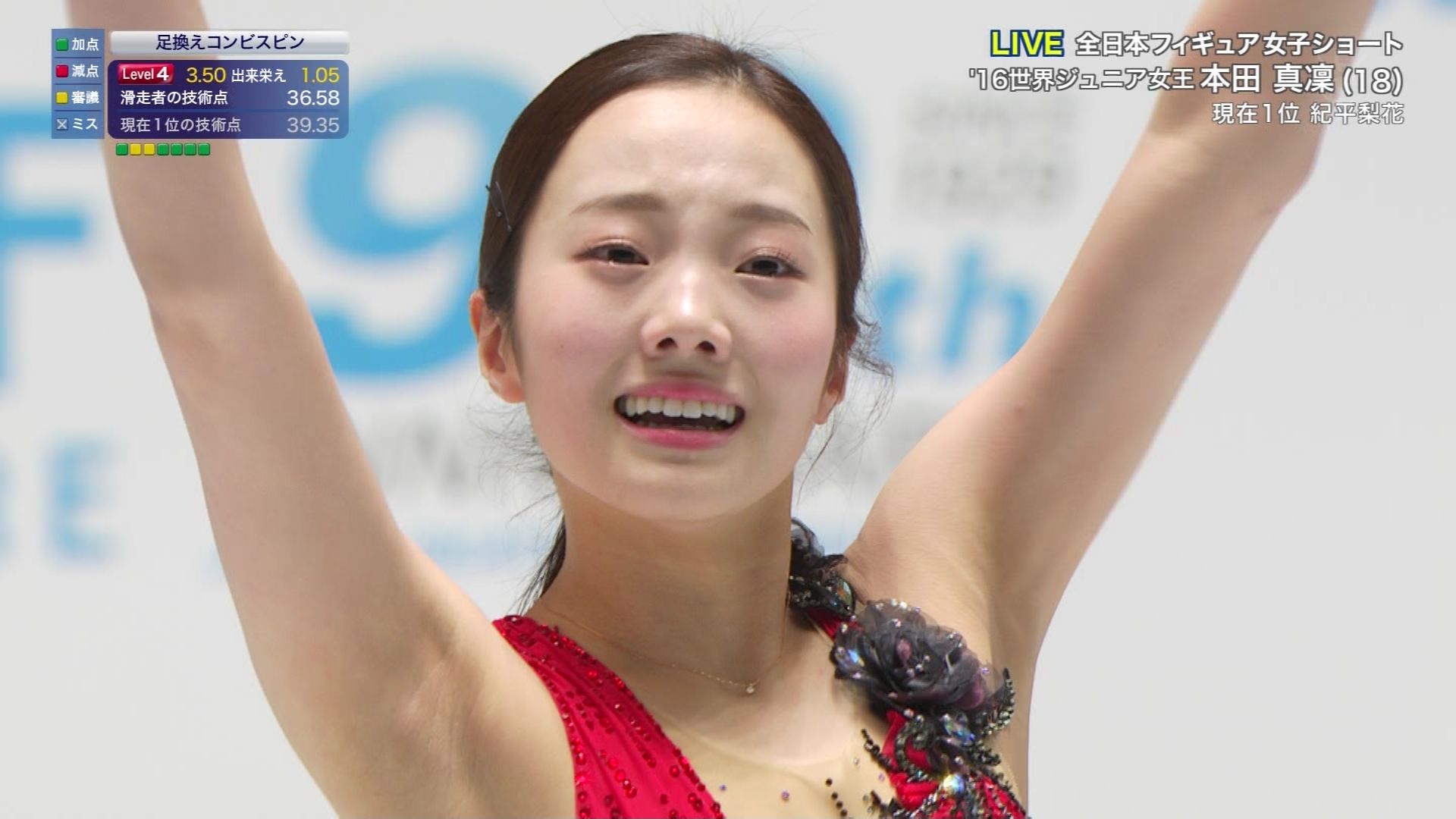 全日本選手権 女子SP 1 紀平梨花 73.98 2 宮原知子 70.11 3 坂本花織 69.95 4 樋口新葉 68.10 5 山下真瑚 66.64 6 本田真凜 65.92 7 川畑和愛 65.53 8 永井優香 64.78 9 横井ゆは菜 62.90 10 新田谷凜 62.27 11 吉岡詩果 60.89 12 竹野比奈 59.52