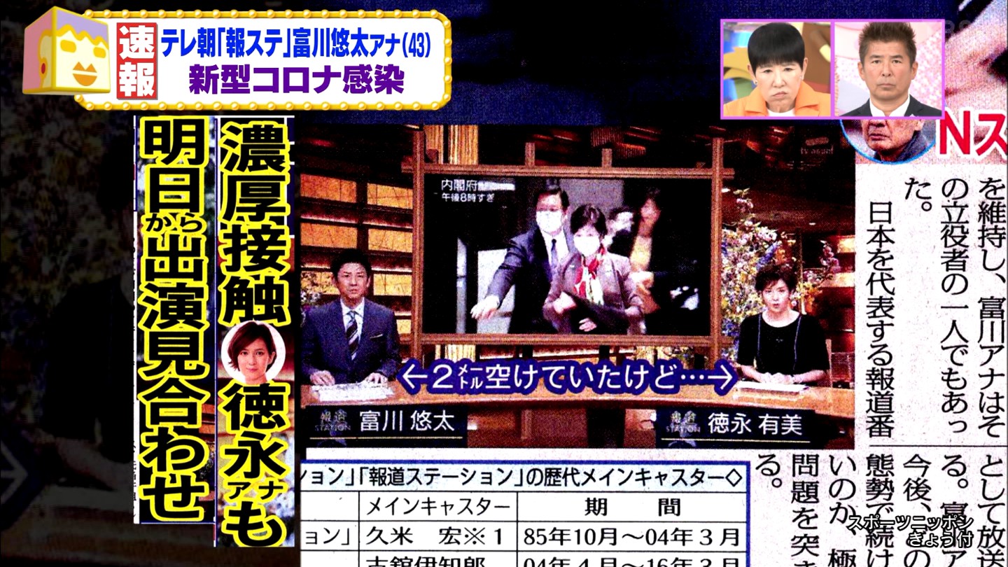 2020/04/12 sanspo 富川アナ♂は9日に体調不良を訴え、入院。11日に陽性が判明した。フリーアナウンサーの徳永有美(44)も濃厚接触者にあたるため、13日の放送からキャスターを一新する処置を取る。