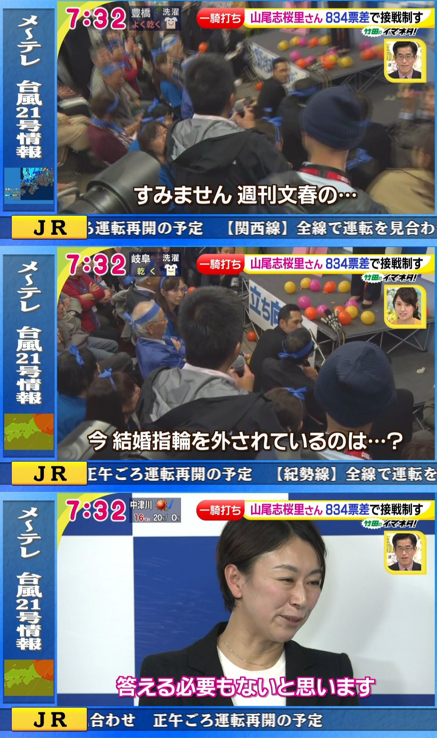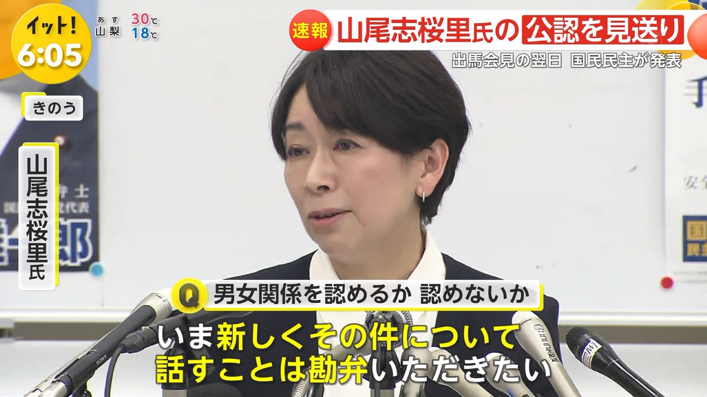 2020/09/25 TBS  衆議院・愛知7区選出の国民民主党・山尾志桜里衆議院議員が会見を開き、次の衆院選で愛知7区からは立候補せず、比例東京ブロック単独1位の候補として出馬することを明らかにしました。