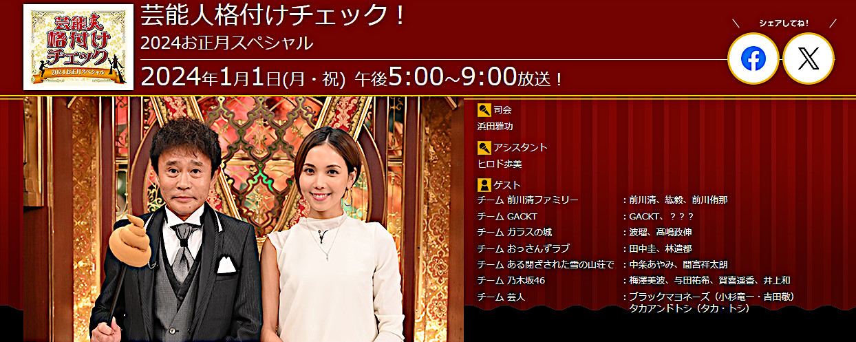 芸能人格付けチェック!2024お正月スペシャル 001 2023/12/19(火) 20:01:37 ID:H1gDk.MN2s 新春恒例のバラエティ『芸能人格付けチェック!2024お正月スペシャル』が元日に放送決定!!大物芸能人、俳優、ミュージシャン、芸人たちが「正月から恥をかけない!」とばかりに、メンツをかけた超真剣勝負を展開する! 今回も格付けマスターを務めるのは浜田雅功。豪華ゲストの中で、誰が真の一流で、誰が映す価値なしなのか!?誰もが頭を悩ませ続けるチェックが続く中で、2024年もまさかの大波乱と、衝撃の展開が…!一瞬も目が離せない展開となった格付けチェック!最後に笑った芸能人、泣いた芸能人は?絶対王者GACKTに番組史上最大の危機が!