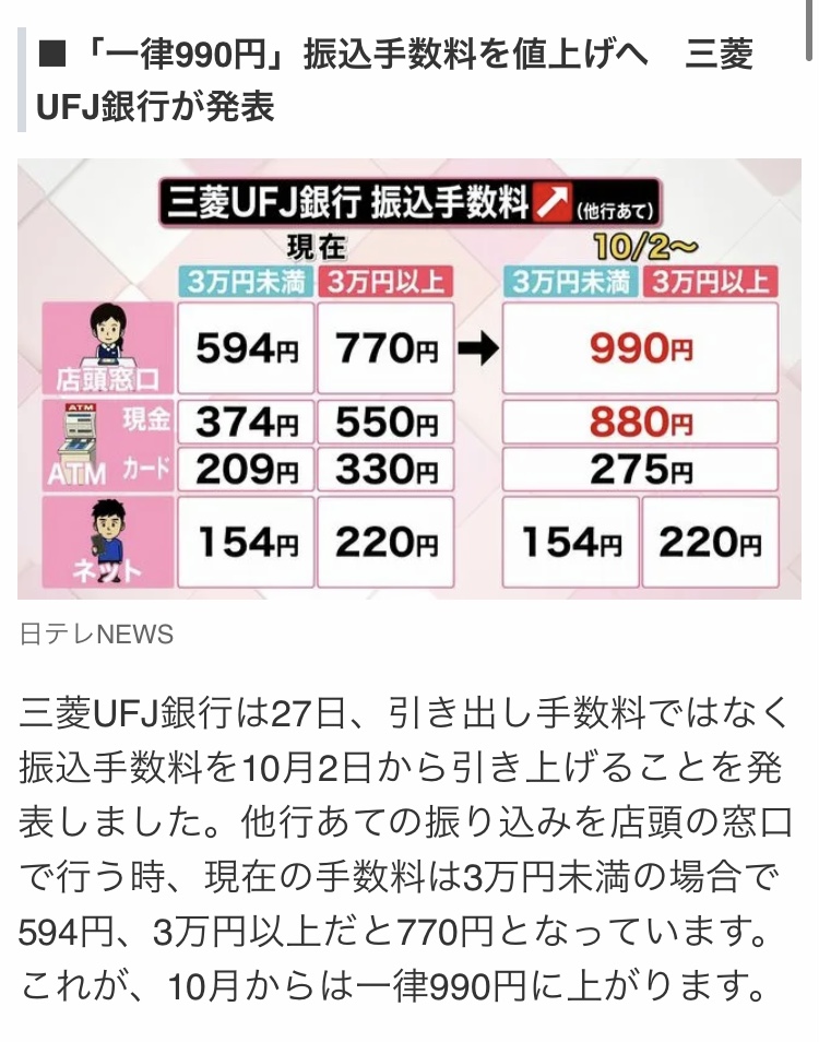 20/01/29(水)12:40:41 コンビニATM、手数料見直しへ 三菱UFJ銀行が5月1日からコンビニエンスストアにあるATMの手数料を見直すことがわかりました。 三菱UFJ銀行は給料日で利用が多い25日や月末などを混雑のピーク日とし、コンビニ内のATMの手数料を引き下げます。 例えば、平日の日中は手数料の110円が無料となりますが、それ以外の日では手数料は値上がりし、セブン銀行のATMでは110円が220円に上がります。 対象はセブン銀行のほか、イーネットやファミリーマート内にある、ゆうちょ銀行のATMとなります。 三菱UFJ銀行は、通常の日は手数料の安い自社のATMに顧客を誘導し、銀行のATMが混雑する日には混雑を緩和するためコンビニでの利用を促す狙いです。