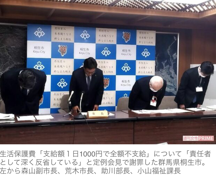 週刊女性PRIME 【独自】桐生市生活保護課の水際・恫喝・ハラスメント「9年が経ちやっと話せる」女性の告白 生活保護費「支給額1日1000円で全額不支給」について「責任者として深く反省している」と定例会見で謝罪した群馬県桐生市。左から森山副市長、荒木市長、助川部長、小山福祉課長 「生活保護費1日1000円」や「ハンコ1944本」などの衝撃的な事実が次々に明らかになっている、群馬県桐生市の生活保護行政。桐生市の生活保護率は2011年をピークに異常としか思えないほどにその数を減らし、却下・取下げ件数の多さも注目されている。果たして、なにがあるのか。生活困窮者の支援活動を行う『つくろい東京ファンド』の小林美穂子氏が語る。