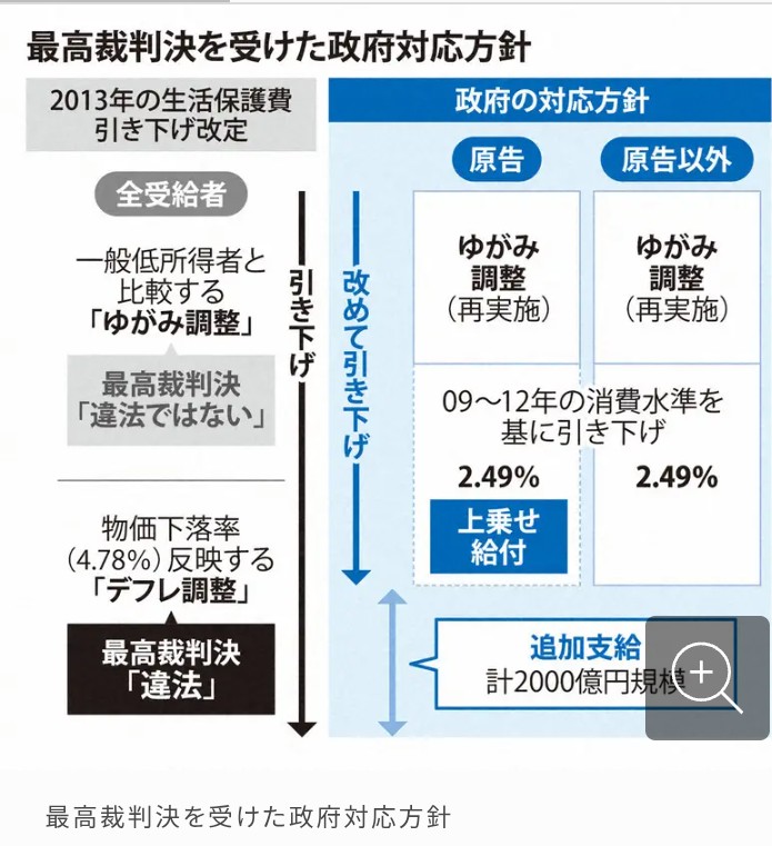2025年6月、最高裁判所は厚生労働省が2013年から3年にわたって生活保護の支給額を段階的に引き下げたことについて専門家の審議を経ないなど、判断の過程に誤りがあり、違法だとして引き下げの処分を取り消しました。