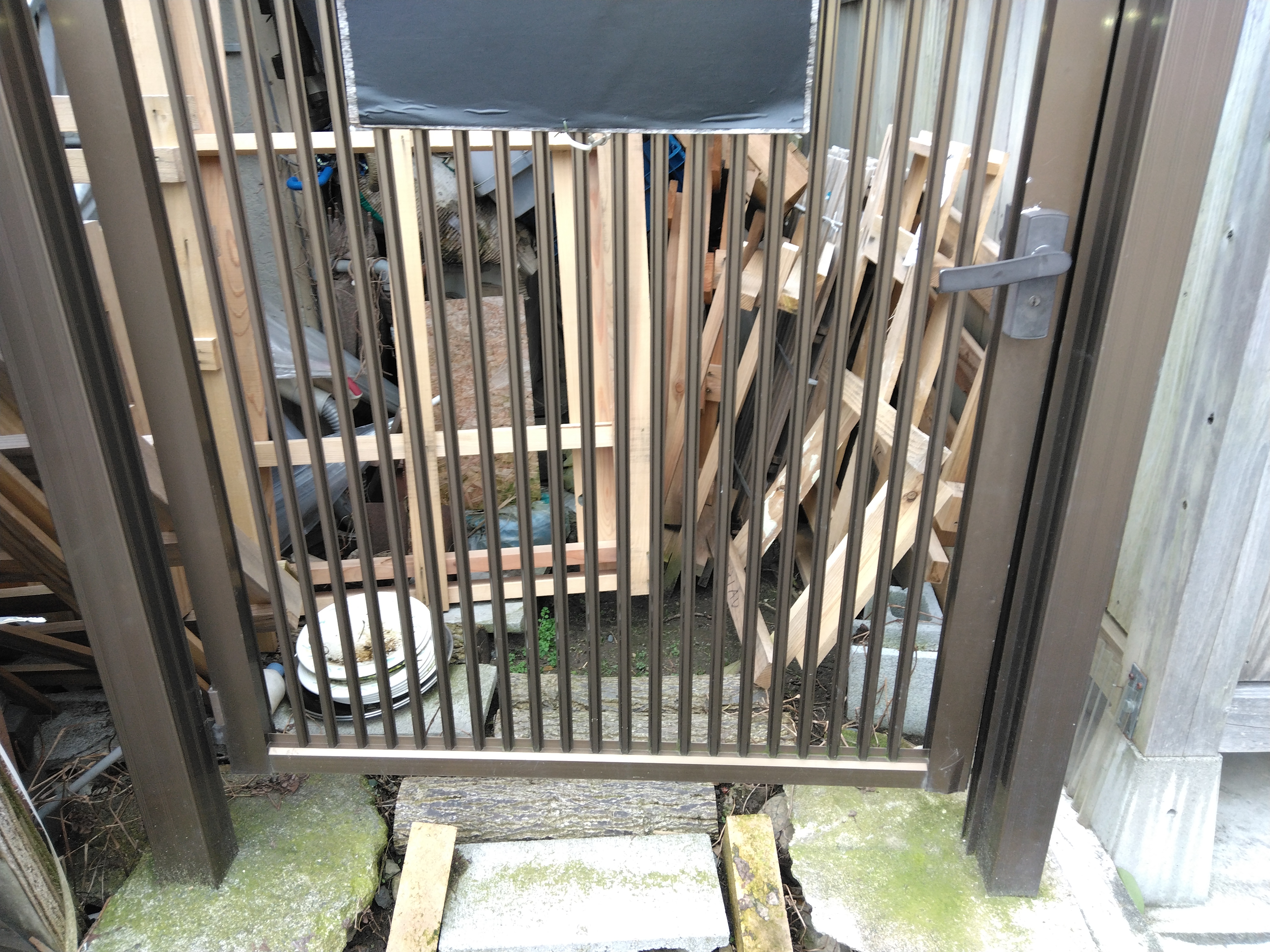 北側門扉倒壊、掘り出し南側移動固定、新出入口